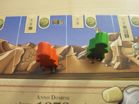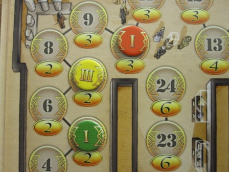 Pergamon spielt sich eigentlich in verschiedenen Abschnitten. Auf dem Spielbrett sind sie wunderbar eingezeichnet und führen die Mitspieler durch die Ausgrabungen. Zu Beginn einer Runde werden die Stollen mit Fundstücken gefüllt. Je tiefer der Stollen, desto wertvoller das Fundstück. Nun kann jeder Spieler sein Forschungsgeld beantragen. Das geschieht auf einer Leiste am oberen Spielfeldrand. Mit seiner Spielfigur zeigt man an, wieviel Geld man erhalten will. Gleichzeitig trifft man auch seine Wahl, in welchen Stollen man später graben könnte.